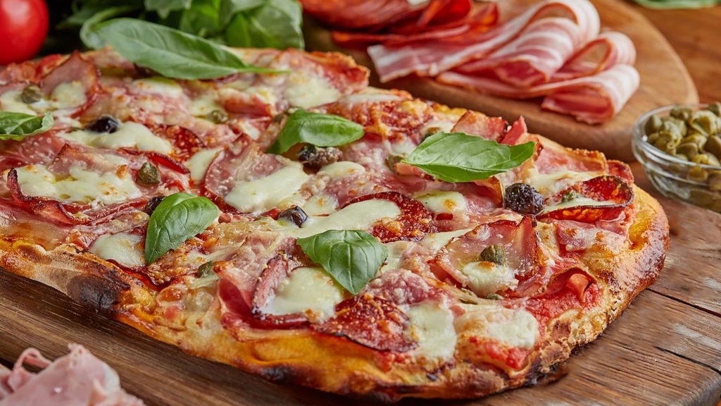base mozzarella, crema di carciofi, capocollo croccante, carciofi trifolati, rucola